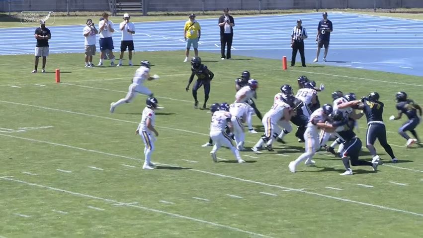 Berlin quarterback Jakeb Sullivan completed 19 of 27 passes (70.3%) for 252 yards, four touchdowns, and four carries for 21 yards leading the Thunder past the Centurions 45-2. Tight end Nicolai Schumann made four catches for 41 yards, and two touchdowns.
