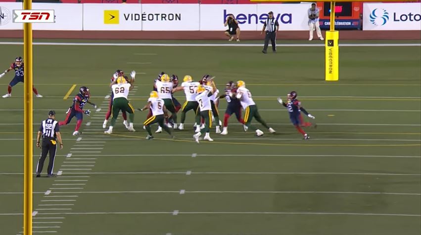 Montreal’s offense had 44 yards (21 yards passing, 23 yards rushing), and Edmonton’s offense had 18 yards (32 yards passing, 2 yards rushing, 16 yards lost).