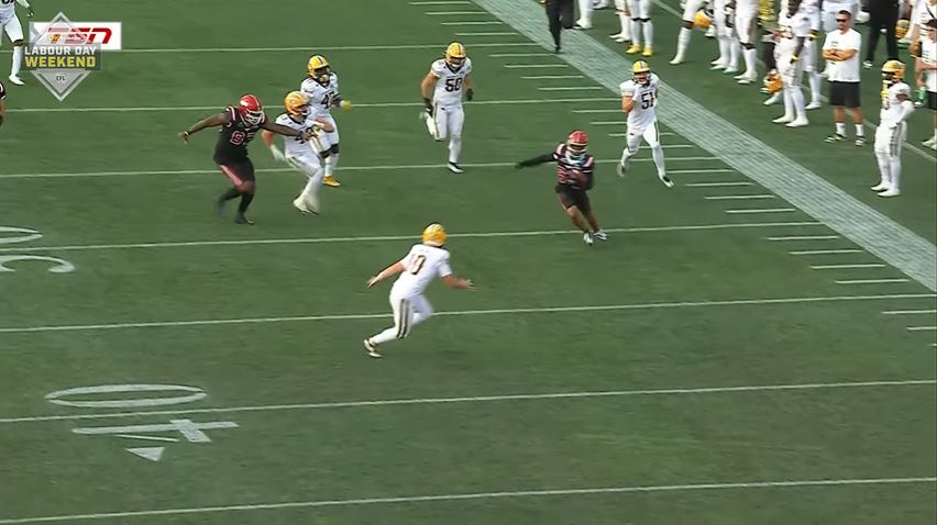 Later, Edmonton’s offense moved the ball to the 18-yard line. However, Edmonton center Phillip Grohovac fumbled the snap, and it was recovered by Calgary defensive back Godfrey Onyeka on the 21-yard line. Calgary running back Dedrick Mills rushed for 13 yards to the 34-yard line, and that was all they got before punting the ball back to Edmonton.