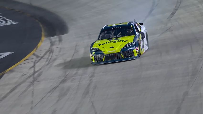 Justin Allgaier led 81 laps to win stage one, and Connor Zilisch led 97 laps to win the second stage. In the final stage, Aric Almirola passed Allgaier for third place on lap 209. Daniel Dye spun at Turn 2 to bring out the caution. Most of the drivers went to pit road, and Almirola was sitting in second place.