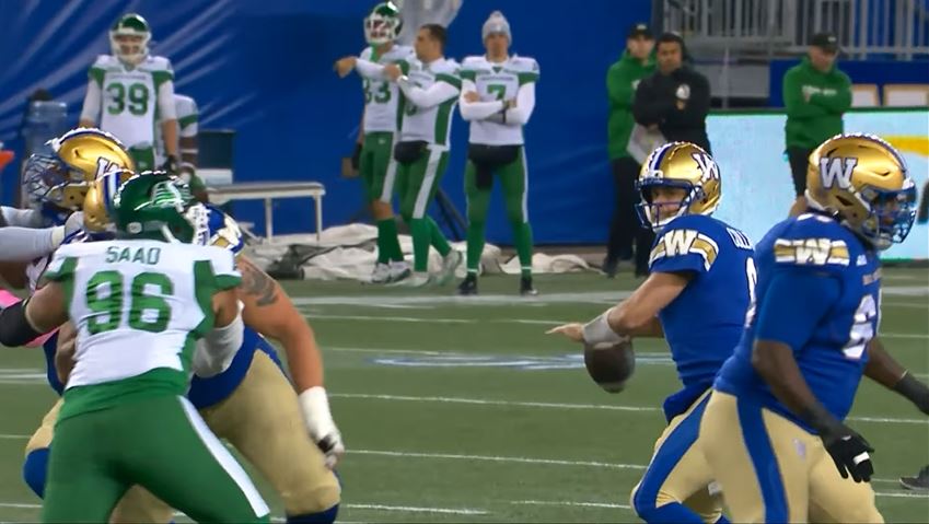 Winnipeg’s offense had the ball on the 29-yard line. Quarterback Zach Collaros started the drive by throwing a 17-yard pass to Gavin Cobb to the 46-yard line. On second down, Saskatchewan’s defense appeared to have stopped Winnipeg to force third down, but a defensive pass interference penalty on C.J. Reavis gave the Blue Bombers a first down.