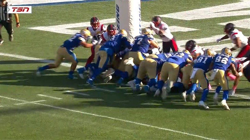 Running back Matthew Peterson rushed for four yards, and Terry Wilson rushed for 14 yards to the one-yard line. Wilson failed twice to score a touchdown. On third down, Wilson scored the touchdown. The Blue Bombers led the Alouettes 13-4 at halftime.