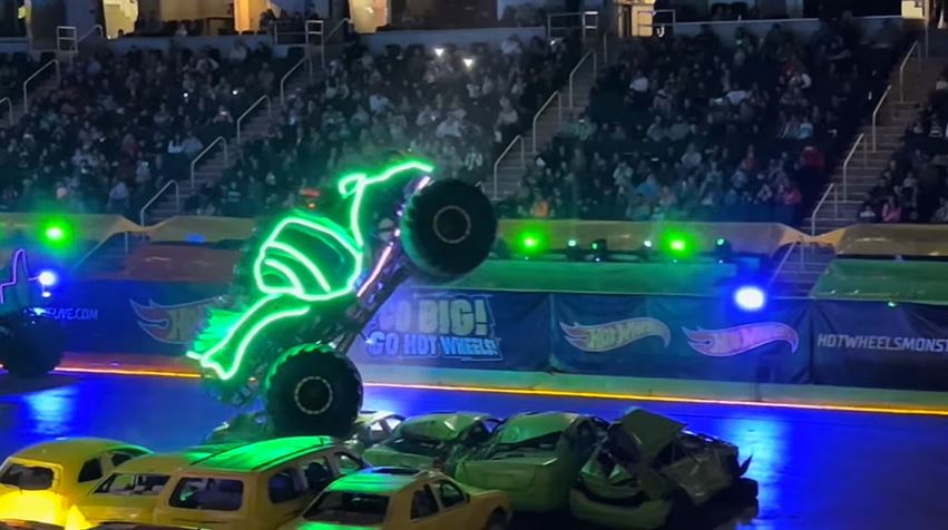 The Hot Wheels Monster Trucks Live Glow-N-Fire tour visited the MVP Arena in Albany, New York, featuring donuts, freestyle, and the wheelie competition. The trucks that competed in the show were Bigfoot, Bone Shaker, Tiger Shark, Mega Wrex, Gunkster, 5-Alarm, and Skelesaurus.