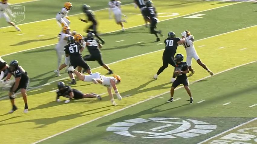 California’s offense had 488 yards (343 yards passing, 145 yards rushing), 29 first downs, and the team was penalized eight times for 85 yards. Quarterback Jaron-Keawe Sagapolutele completed 28 of 39 passes (71.8%) for 323 yards, one touchdown, four carries for 15 yards, and one rushing touchdown.