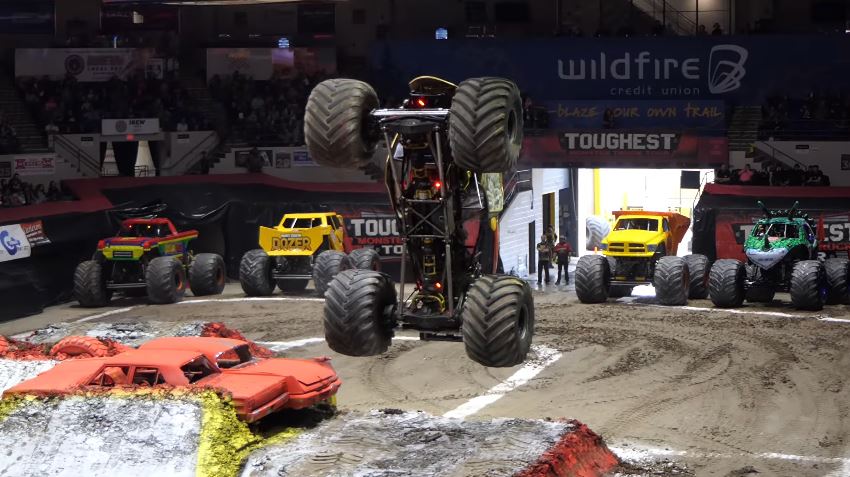 The Toughest Monster Truck Tour visited the Dow Event Center in Saginaw, Michigan, featuring the wheelie competition, racing, and freestyle. The Trucks that competed in the show were Block Head, Dirt Crew, Jurassic Attack, Maximus, Dirt Crew Dozer, and Velociraptor.