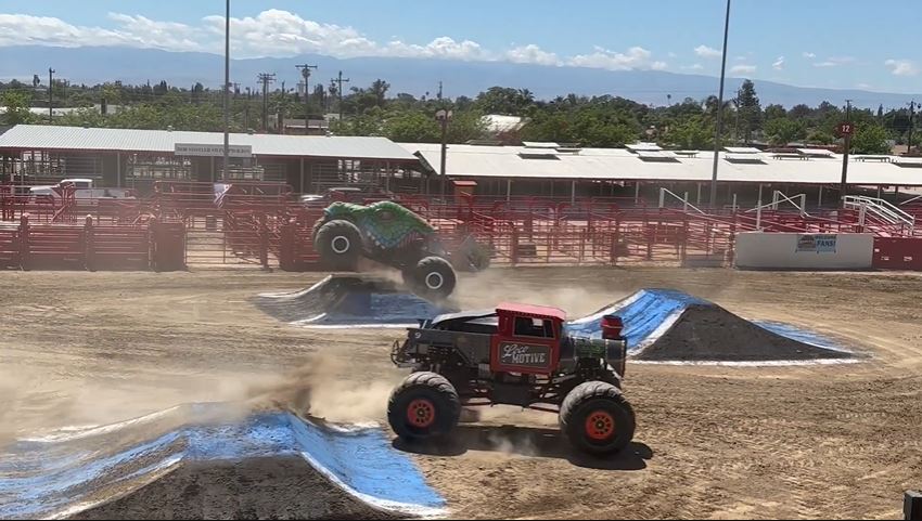 The Monster Truck Wars visited the Kern County Fairgrounds in Bakersfield, California, featuring wheelies, racing, and freestyle. The trucks that competed in the show were Outlaw, Shark Attack, Sheriff, T-Rex, and Loco Motive.